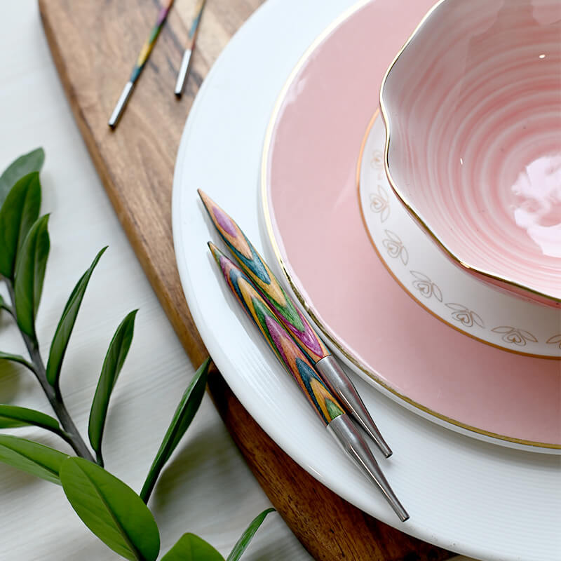 Las agujas circulares intercambiables de Symfonie están disponibles en 2 longitudes de aguja con una variedad de longitudes de cable sin pliegues para una amplia gama de proyectos de tejido, desde pequeños a grandes.